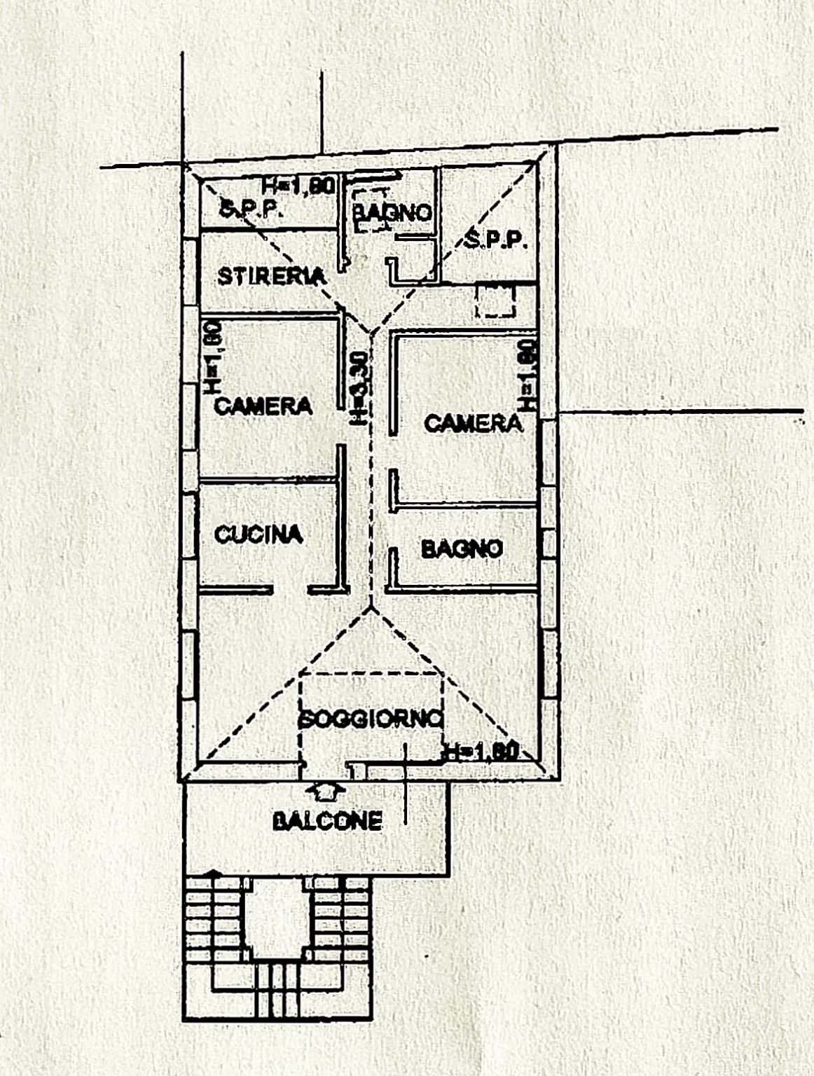 Trattandosi di un attico mansardato, l'altezza minima è di 180 cm. (vedi foto: nell'immagine mi sono posizionato di spalle davanti a una delle porte-finestre della camera per rendere immediatamente percepibile il rapporto reale con le altezze; io sono alto 175 cm).